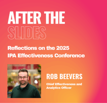 “Effectiveness has entered a new phase: less about proving it, and more about improving it.” – Rob Beevers After his breakout session at the IPA Effectiveness Conference, our Chief Effectiveness and Analytics Officer Rob Beevers reflects on how the conversation has evolved...